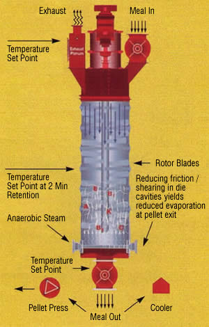 The anaerobic environment (approximately 4% oxygen) suffocates aerobic bacteria while the long-term conditioning pasteurizes each particle at controlled moisture and temperature levels. Continuous input of cool meal or groin to the upper section of the material column allows for optimum energy scrubbing, keeping exhaust temperatures well below conditioning temperatures. Feed ingredients condense in the cooler moss and are not lost to ambient.